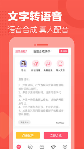 语音合成助手免费版本是一个非常专业的语音配音软件,该软件适用于商场商店促销配音、广告促销配音、英语听音频制作等,功能可以满足用户的不同需求,语音合成助理免费版本也支持文本转换语音一键合成,支持一键与朋友分享,感兴趣的朋友不要错过!