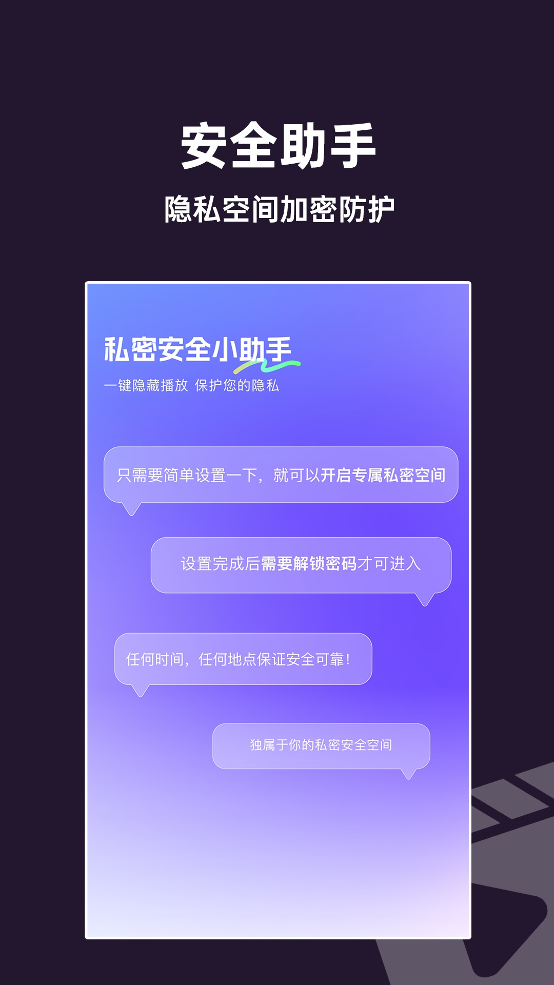 隐私全能播放器是一款融合音频与视频播放,以及隐私保护功能的多媒体应用程序,帮助用户轻松管理本地和线上媒介内容。它兼容多种主流音视频格式,并且利用先进的加密技术和智能化分类系统,为您打造一个既安全又便捷的私人娱乐空间。无论是追剧消遣、听歌放松还是存储珍贵记忆,它都能满足您的多样化需求,实现高效的内容管理。
