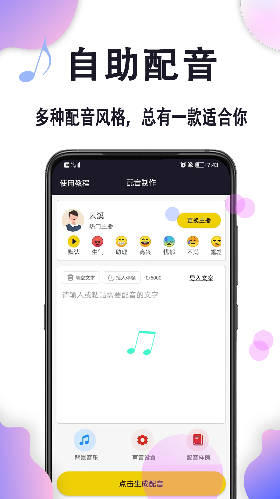 操作高效、响应迅速是自助配音的重要优势之一。它能够在较短的时间内完成复杂的配音任务,大幅度节省时间和人力资源。尤其适用于急需完成配音工作的项目,用户无需依赖专业配音人员,只需简单操作即可获得满意的结果。其配音的音质极高,语音自然清晰,基本满足大多数用户对音质的严苛要求。软件在安全保障方面也表现出色,用户无需担心个人信息泄露或配音内容被非法使用。与此同时,软件提供优质的客户支持服务,遇到任何问题都可以及时联系官方客服,得到专业、及时的解决方案。