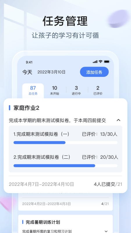 讯飞语墨需结合专用的智能本硬件一同使用,家长只需绑定孩子的学生账户,即可在手机端查看详细的学习数据分析。主界面会呈现孩子每日的学习状况,比如学习总时长、任务完成率等关键指标。家长可以根据不同模块查阅孩子的具体学习内容,例如写作练习、课文朗读、诗词背诵等项目。软件还内置智能算法,利用雷达图方式直观显示孩子在写作技能、阅读理解、学习习惯培养等方面的综合水平评估。家长还能利用软件布置亲子互动任务,如共同朗读课文或完成写作实践,既促进亲子关系,又巩固学习成果。对于线下完成的作文内容,只需拍照上传,系统即可实现自动批改并提供详尽的分析报告。