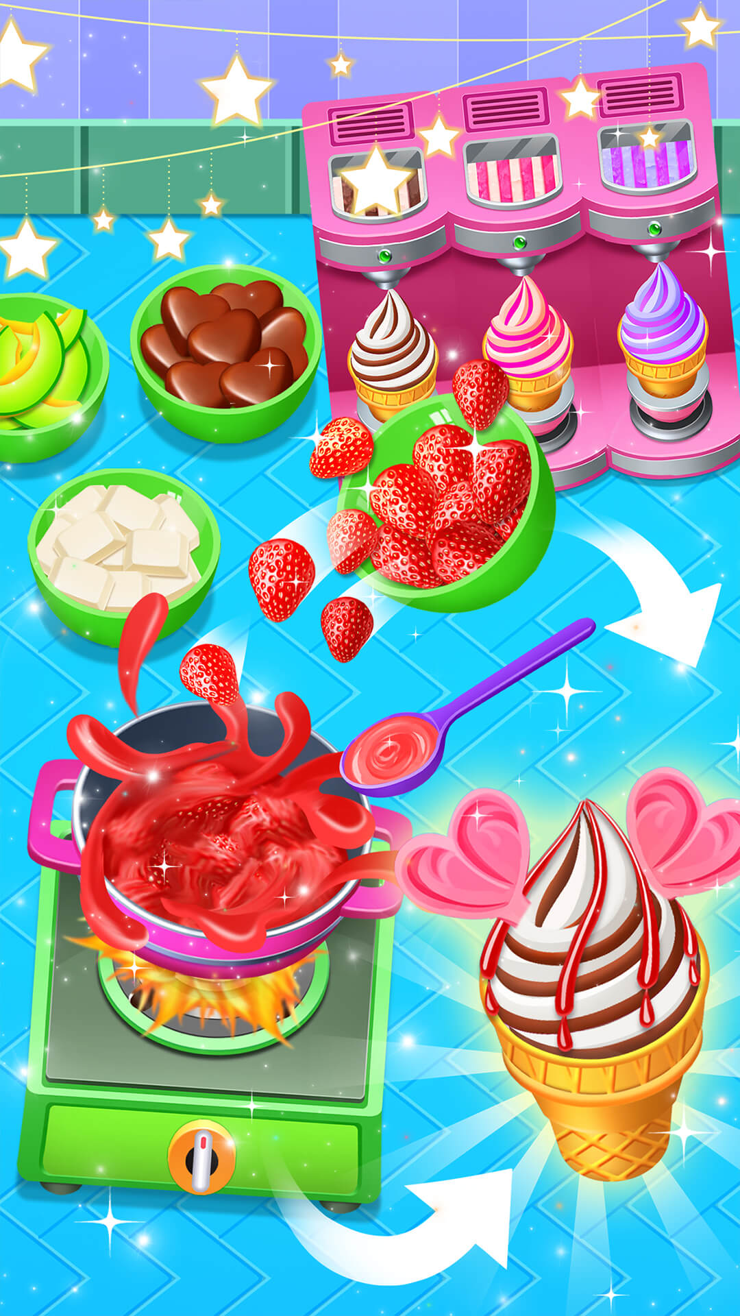 操作简便,奶奶级玩家都能轻松上手——只需一点点操作,拖动几下即可完成。但想要成为高级店主,还需要动脑筋,合理安排制作流程以节省时间。画面色彩鲜艳,宛如调色盘洒落,看到五彩缤纷的冰淇淋立刻让人心情愉快。内容更新频繁,每月都会推出新口味或限定活动,绝不让你觉得无聊。最棒的是,没有烦人的弹窗广告,沉浸式体验满分,专注享受甜品制作带来的治愈时光。所有食材与工具都配备简短科普,让你在玩乐中也学到不少甜品冷知识!