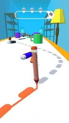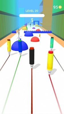 核心玩法围绕“冲”字展开——彩笔会自动前行,玩家只需左右滑屏调整方向,或向上跳跃、向下蹲伏,操作简便到新手三秒即可掌握。但别以为操作简单就代表易过关——关卡中的障碍质量会逐步提升,比如突如其来的彩色滚球、高低错落的跳台,以及会移动的陷阱。游戏设有两种模式:彩笔奔跑模式专注于跑酷闯关,木头人模式则还原了“鱿鱼游戏”的刺激规则,稍有不慎就会被淘汰,极大考验玩家的心理素质。每一关都需要收集蓝色墨水瓶以补充能量,越跑越远积分越高,还能解锁炫酷的彩笔皮肤以及丰富的特效装饰品。
